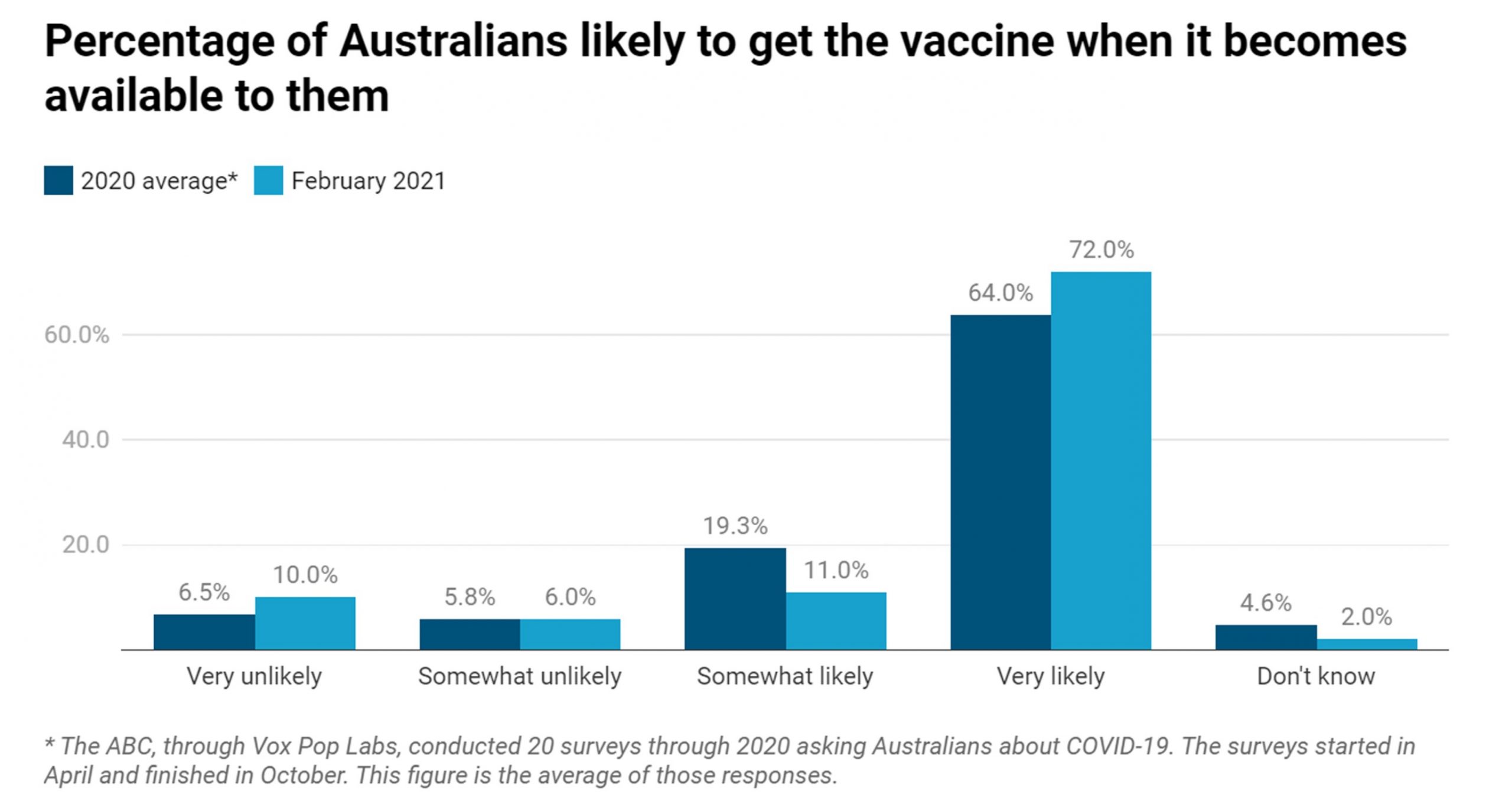 As Australia’s vaccine rollout slowly gathers pace with the first jabs of the AstraZeneca vaccine taking place in South Australia on Friday, the survey found 72 per cent of Australians are “very likely” to get a COVID-19 vaccine.