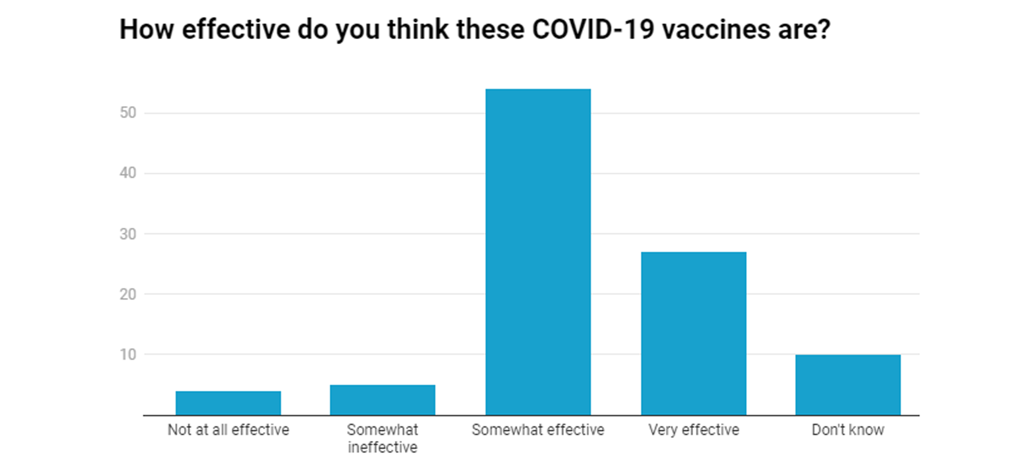 On the subject of efficacy, 54 per cent believed the vaccines were “somewhat effective” and 27 per cent “very effective”.