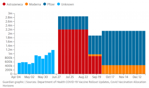 Showing new vaccine availability per week. Weeks through July from Department of Health weekly COVID-19 vaccine rollout updates. July through December according to the Department of Health’s June 2021 Allocation Horizons.
