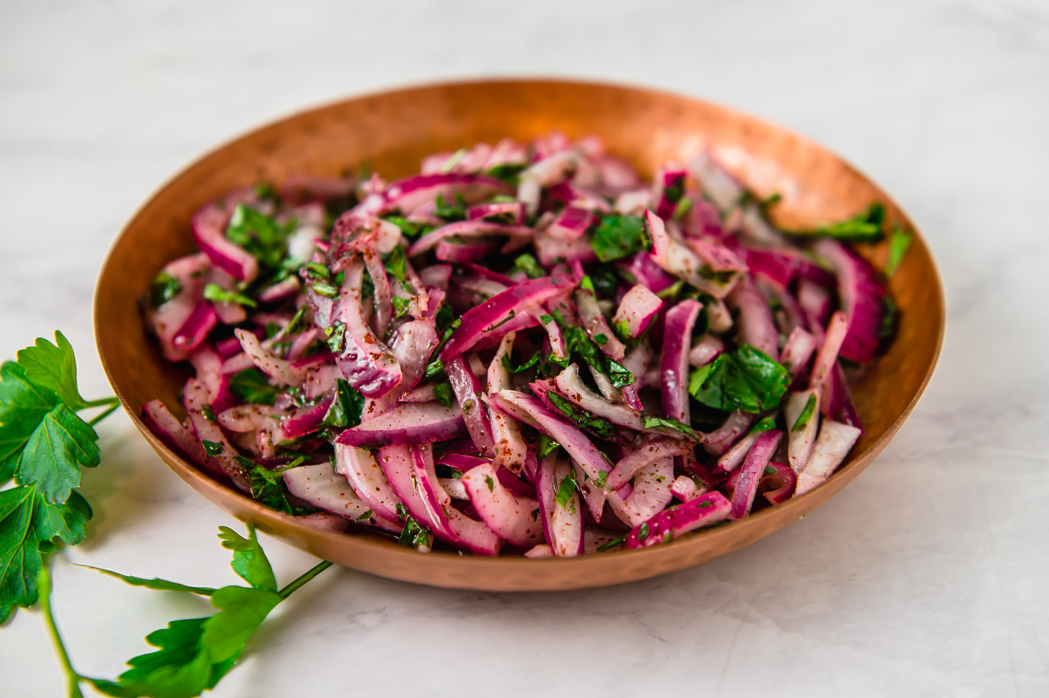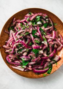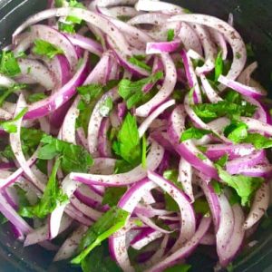 2. Sprinkle sumac, salt and red pepper flakes over onions. Gently massage them with your hand.