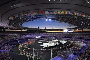 Athletes take part in the athletes parade during the closing ceremony of the Paris 2024 Olympic Games at the Stade de France, in Saint-Denis, in the outskirts of Paris, on August 11, 2024.